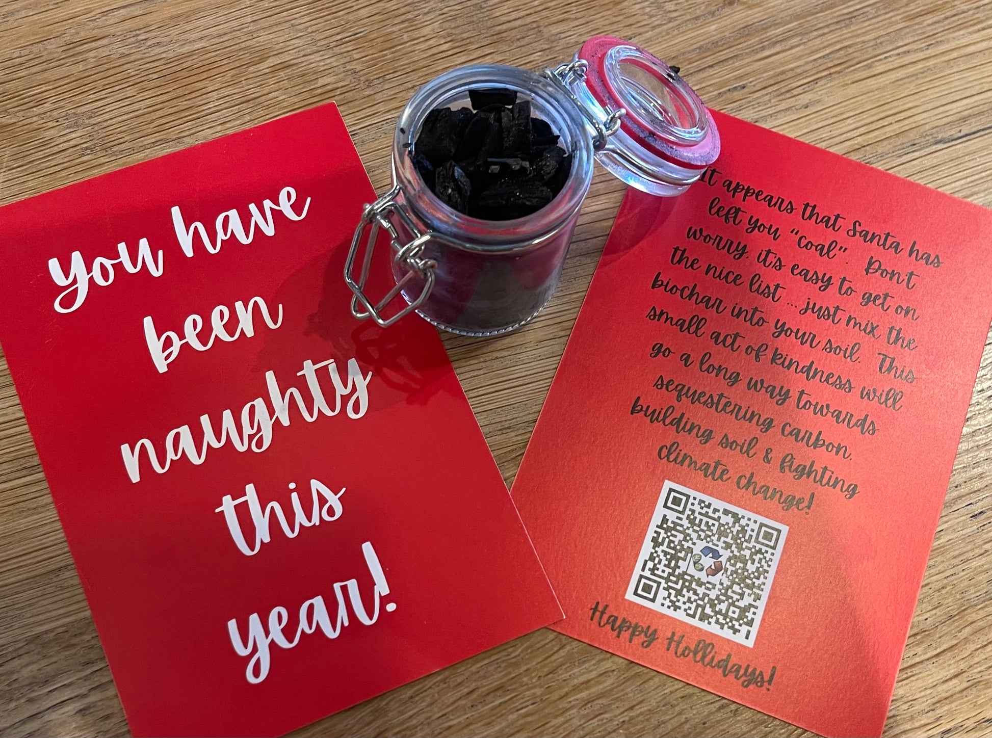 Do you know anyone who’s been naughty? Get them some “coal” (biochar) for Christmas and give them the opportunity to make amends by adding it to their soil and help fight climate change by sequestering carbon and building soil.